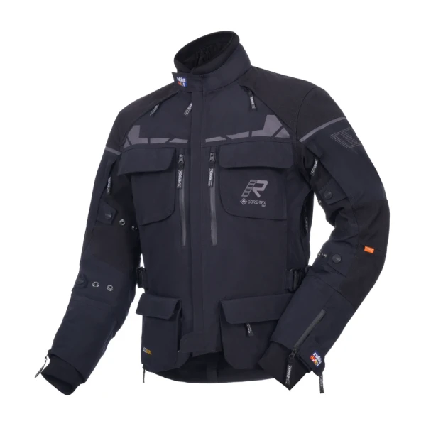 Rukka Adventure motorjas voor heren. Zacht neopreen in kraag. Geïntegreerde beschermende ATS (=attached storm collar) GORE-TEX Stretch kraag, die in de zak kan worden opgeborgen. Stretchpanelen onder de armen en op de rug. Mouwuiteinden met ritsen en waterdichte binnenmanchetten. Breedteverstelling op boven- en onderarm met drukknopen. Verstelbare zoom en mouwuiteinden met klittenbandsluiting. Een kruisriem en een lange verbindingsrits voor broeken. Verstelbare heupriem aan de zijkanten. 100% ademend, wind- en waterdicht GORE-TEX Pro 3-laags gelamineerd op slijtvast en scheurbestendig CORDURA® shell-materiaal. Slijtvaste CORDURA® 1500D versterkingen op schouders en ellebogen. Twee waterafstotende lage zakken met ritsen en drukknopen. Twee borstzakken met drukknopen. Een grote waterbestendige zak op de onderrug.